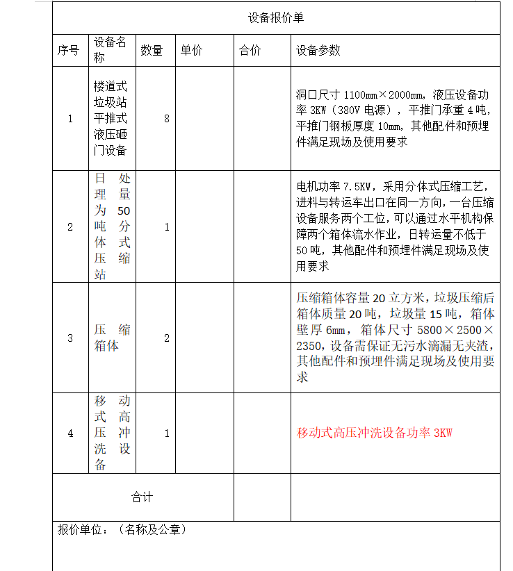 二、詢價內(nèi)容:1、樓道式垃圾站平推式液壓砸門設(shè)備及其配件8套;2、20立方米分體式壓縮站(包含一臺壓縮機(jī)構(gòu)、兩個箱體、一套水平移動機(jī)構(gòu)、移動式高壓清洗設(shè)備一套)及其配件1套(配套原有勾臂車使用)