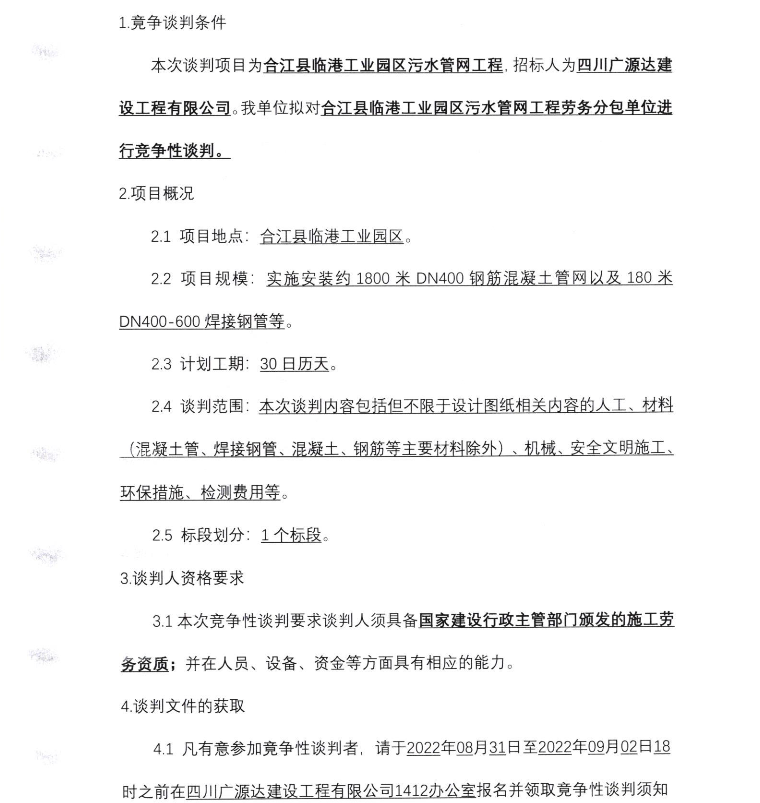 合江縣臨港工業(yè)園區(qū)污水管網工程勞務分包