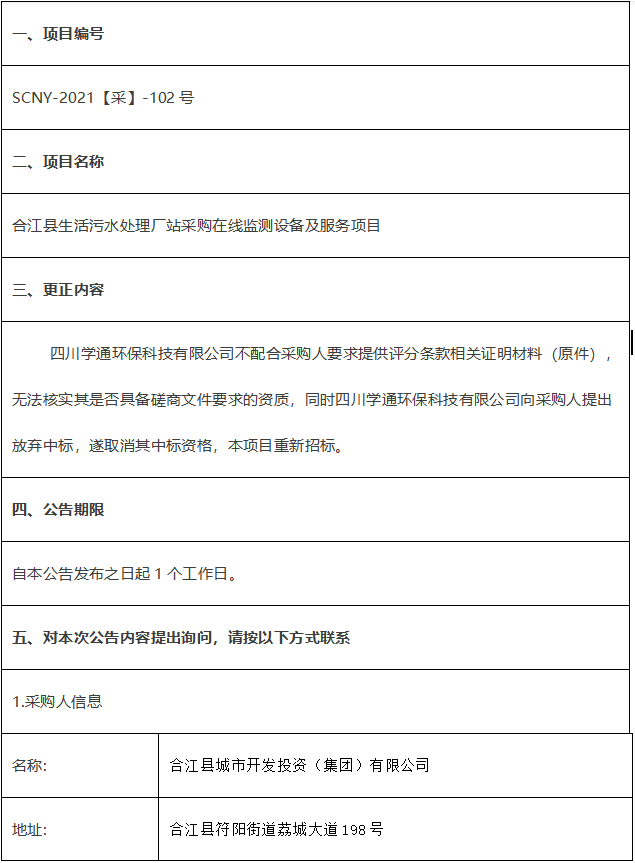 合江縣生活污水處理廠站采購(gòu)在線監(jiān)測(cè)設(shè)備及服務(wù)項(xiàng)目競(jìng)爭(zhēng)性磋商結(jié)果更正公告