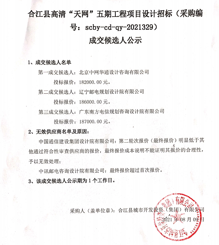 合江縣高清“天網(wǎng)”五期工程項(xiàng)目設(shè)計(jì)招標(biāo)成交候選人公示