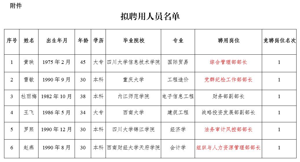 根據(jù)《瀘州阜陽(yáng)投資集團(tuán)有限公司關(guān)于2020年本部中層管理崗位內(nèi)部競(jìng)聘的公告》(瀘阜投〔2020〕20號(hào))規(guī)定,經(jīng)阜陽(yáng)集團(tuán)黨委研究決定,擬聘用黃映等6人為瀘州阜陽(yáng)投資集團(tuán)有限公司本部中層管理人員。現(xiàn)面向社會(huì)公示7個(gè)工作日,公示時(shí)間2020年6月2日至2020年6月10日。公示期間,如有問題,請(qǐng)及時(shí)向?yàn)o州阜陽(yáng)投資集團(tuán)有限公司組織與人力資源管理部反映。要求舉報(bào)者署實(shí)名,實(shí)事求是地反映問題,并提供必要的調(diào)查線索。
