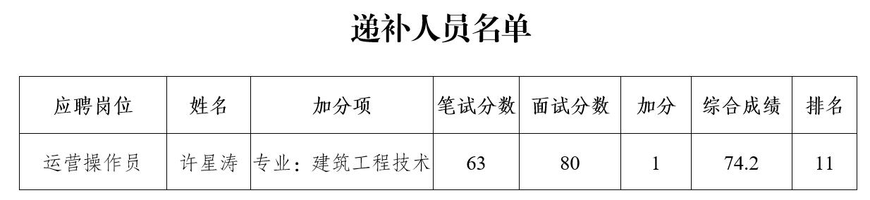 根據(jù)《瀘州阜陽投資集團(tuán)有限公司關(guān)于合江縣城市開發(fā)投資(集團(tuán))有限公司下屬子公司合江縣華陽水業(yè)有限公司2020年公開招聘工作人員的公告》的規(guī)定,按綜合成績排名,因1名擬聘用人員自動(dòng)放棄,現(xiàn)將擬聘用人員的遞補(bǔ)人員名單面向社會公示7個(gè)工作日,公示時(shí)間2020年7月8日至2020年7月16日。公示期間,如有問題,請及時(shí)向?yàn)o州阜陽投資集團(tuán)有限公司組織與人力資源管理部反映。要求舉報(bào)者署實(shí)名,實(shí)事求是地反映問題,并提供必要的調(diào)查線索。