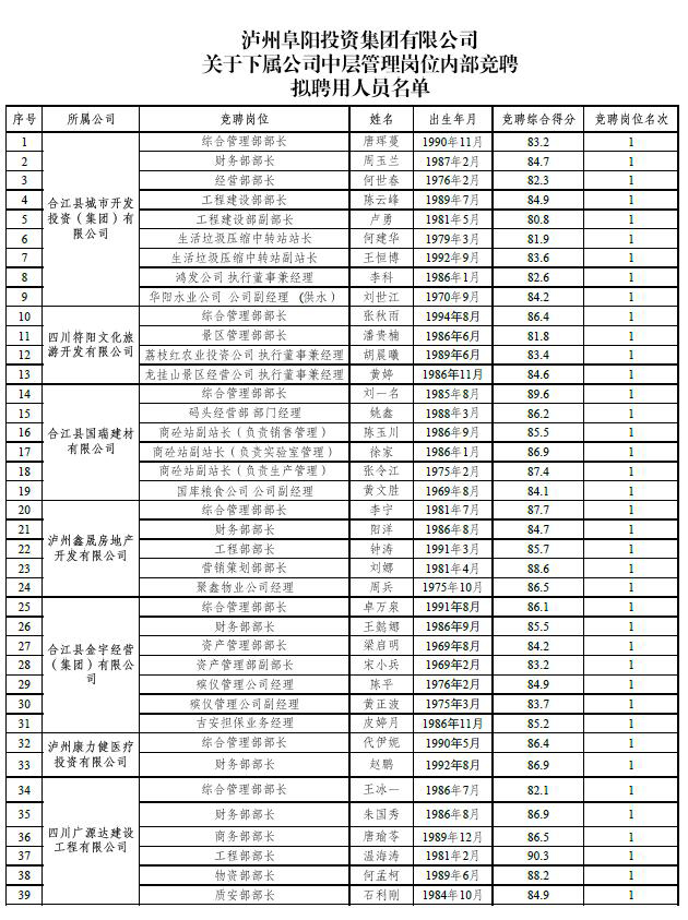 根據(jù)《瀘州阜陽投資集團有限公司關于下屬公司中層管理崗位內(nèi)部競聘工作的公告》(瀘阜投發(fā)〔2020〕21號)的規(guī)定,經(jīng)阜陽集團黨委會研究決定,擬聘用唐琿蔓等39人為瀘州阜陽投資集團有限公司下屬公司中層管理人員?,F(xiàn)面向社會公示7日,公示時間2020年6月19日至2020年6月25日。公示期間,如有問題,請及時向瀘州阜陽投資集團有限公司組織與人力資源管理部反映。要求舉報者署實名,實事求是地反映問題,并提供必要的調(diào)查線索。