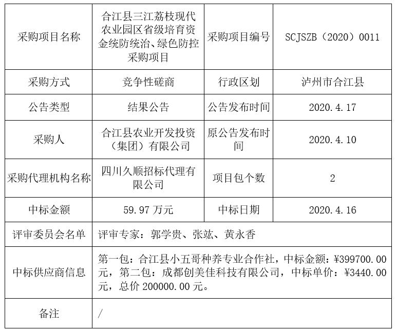 合江縣三江荔枝現(xiàn)代農業(yè)園區(qū)省級培育資金統(tǒng)防統(tǒng)治、綠色防控采購項目競爭性磋商結果公告