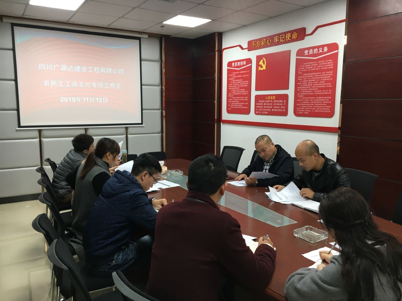 2019年11月12日,四川廣源達(dá)建設(shè)工程有限公司譙棣升董事長主持召開農(nóng)民工工資支付專項工作會,公司各部門負(fù)責(zé)人、項目經(jīng)理參會。