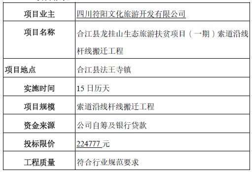 請(qǐng)通過(guò)資格審查的參加競(jìng)爭(zhēng)性談判人員帶好有效身份證、公司介紹信、授權(quán)委托書、資質(zhì)證明等資料的原件與復(fù)印件(上述復(fù)印件須蓋單位鮮章,原件查驗(yàn)后當(dāng)場(chǎng)退還。于北京時(shí)間2019年9月18日9:00,在四川省瀘州市合江縣荔城大道190號(hào)四川符陽(yáng)文化旅游開發(fā)有限公司二樓會(huì)議室公開舉行合江縣龍掛山生態(tài)旅游扶貧項(xiàng)目(一期)索道沿線桿線搬遷工程競(jìng)爭(zhēng)性談判活動(dòng),四川符陽(yáng)文化旅游開發(fā)有限公司根據(jù)承諾報(bào)價(jià)最低價(jià)原則確定中選人。
