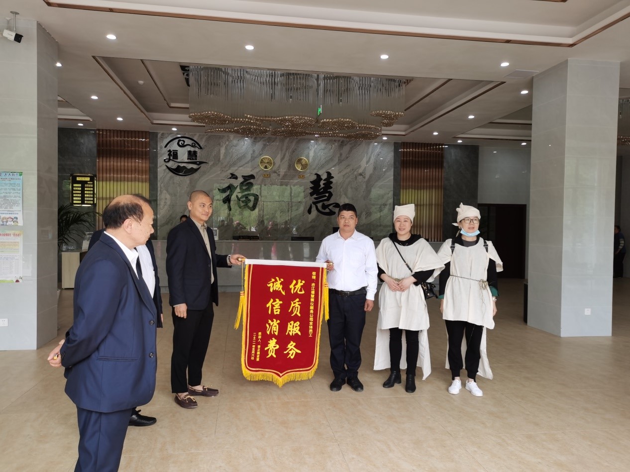 5月6日,家屬李正攜全家走進(jìn)合江縣?;蹥浽岱?wù)有限公司,將一面“誠(chéng)信消費(fèi)優(yōu)質(zhì)服務(wù)”的錦旗送到殯儀服務(wù)中心工作人員的手中。