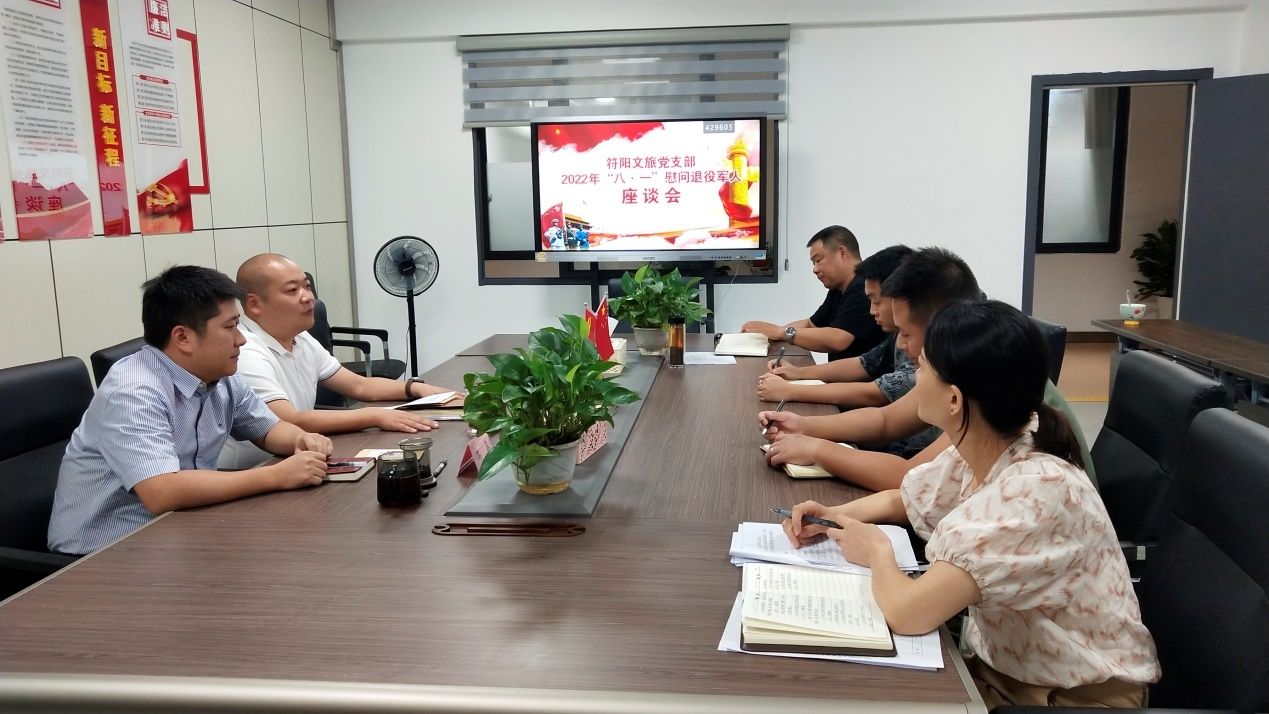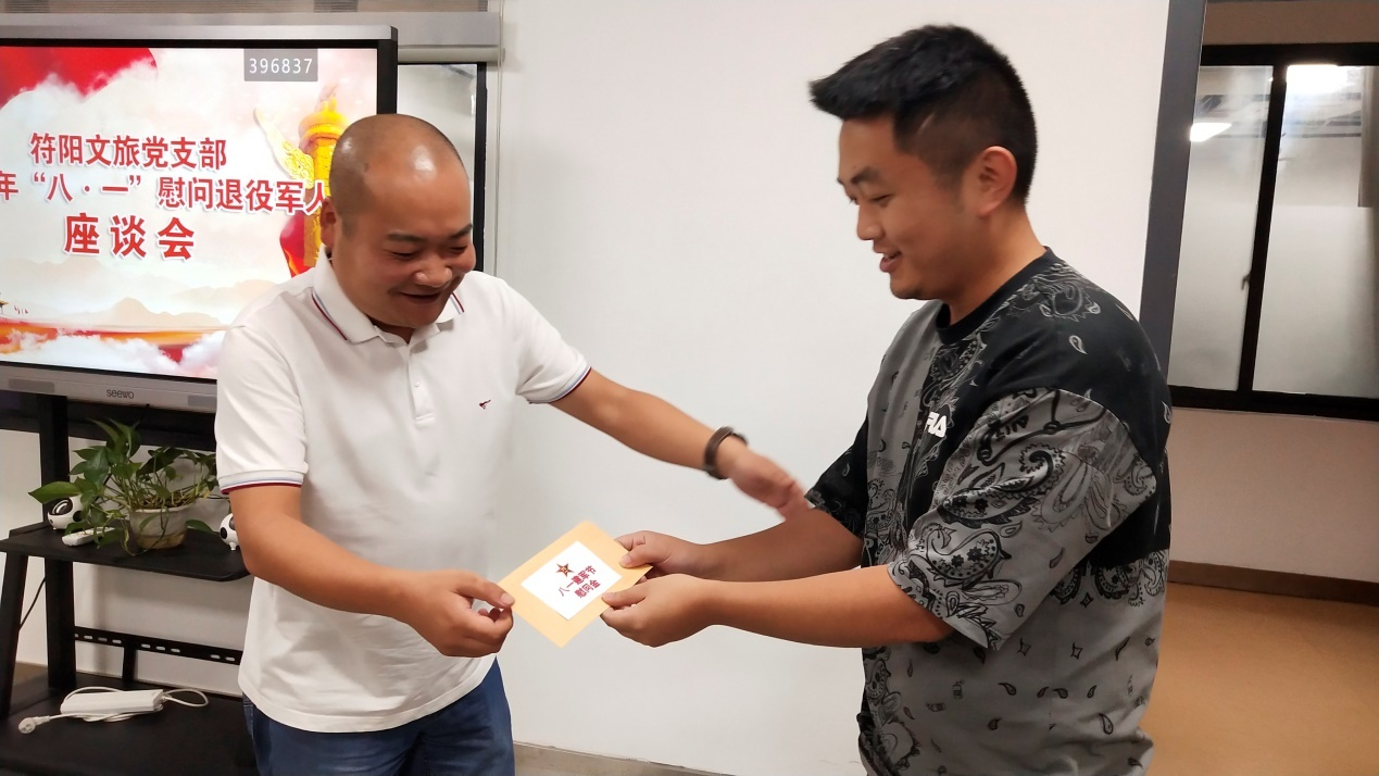 為扎實(shí)做好擁軍優(yōu)屬 、 擁政愛民工作 , 在 “ 八 一 ” 建軍節(jié)來臨之際, 符陽(yáng)文旅黨支部開展 “ 八一 ” 慰問活動(dòng), 組織文旅 公司工作的退役軍人召開座談會(huì), 了解他們的工作和生活情 況, 為他們送上慰問金, 并致以節(jié)日的祝福。 退役軍人表示 感受到公司的關(guān)懷和愛心,在今后的工作中發(fā)揮軍人本色, 為公司發(fā)展貢獻(xiàn)力量。